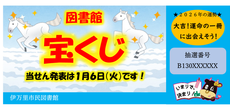 「ほんのお歳暮」の中に入れておりました「図書館宝くじ」の当せん番号は以下のとおりです。