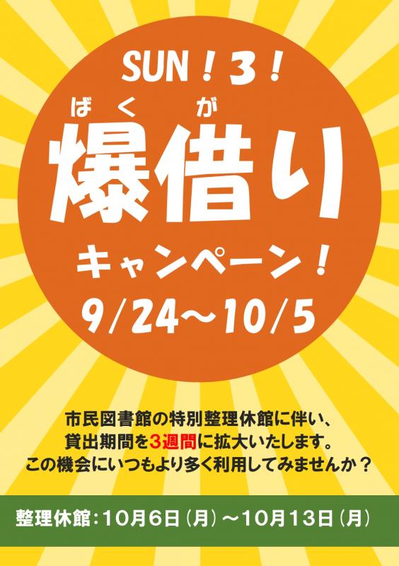 貸出期間3週間!爆借りキャンペーンを実施します 投稿日時 : 09/20 HP管理者 図書館の蔵書点検に伴う特別整理休館のため、貸出期間が通常より長くなる爆借りキャンペーンを実施します。特別整理休館について、詳しくはこちら。 爆借りキャンペーンについて 実施期間:令和7年9月24日(水)~10月5日(日)貸出期間:通常2週間→キャンペーン中は3週間に拡大!
